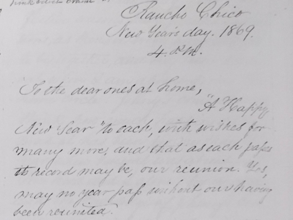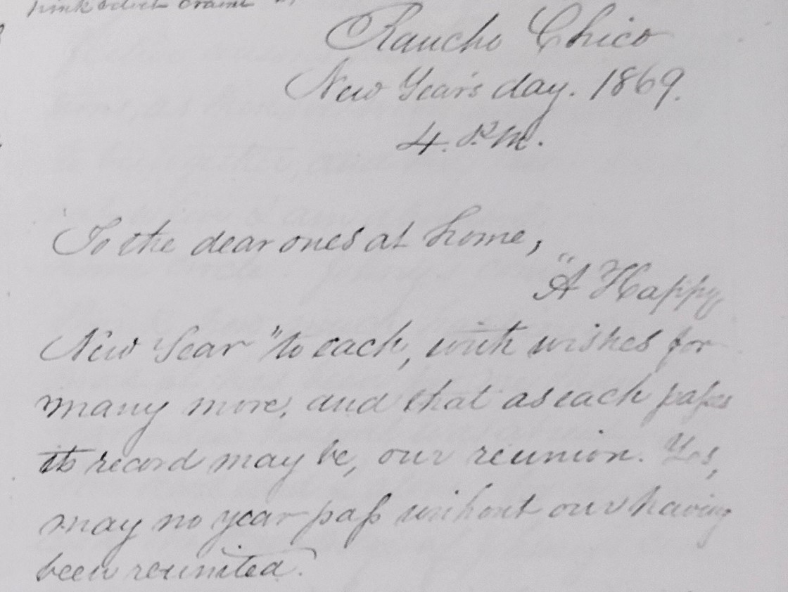 Picture Annie Bidwell, sitting by the fireplace in the newly finished Bidwell Mansion, writing a New Year’s Day letter to “the dear ones at home” in Washington D.C.