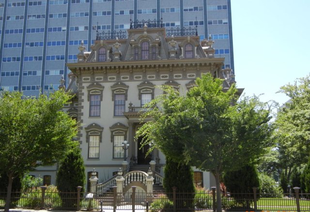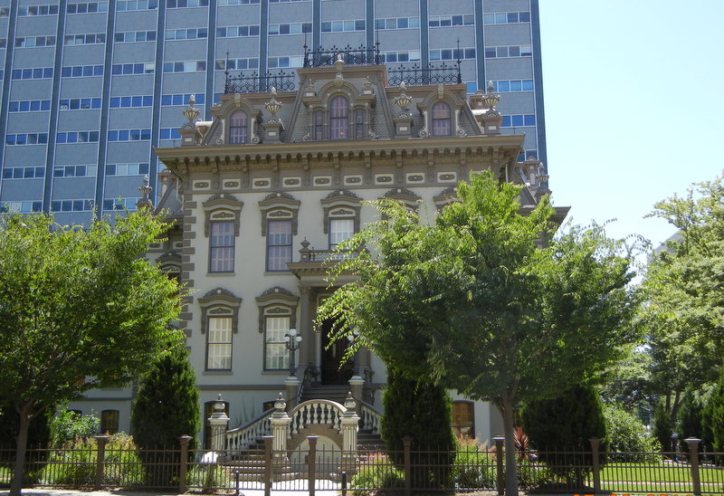Leland Stanford Mansion in Sacramento: Stanford’s home when he served as governor 1861-1863. This is the house where Leland Stanford Jr, who died at the age of 15, was born and raised. The mansion is dressed to the nines in the most opulent and ostentatious Victorian fashion, but the rooms are small for the amount of decoration they have to carry. The house started as a small townhouse, then was expanded and then expanded again and again–more rooms were added, but the original rooms stayed small. Stanford even raised the entire house and inserted a new ground floor under the old one, adding a sweeping double stairway up to the front door. It is a gorgeous home, used by the state of California for receptions and other protocol functions.