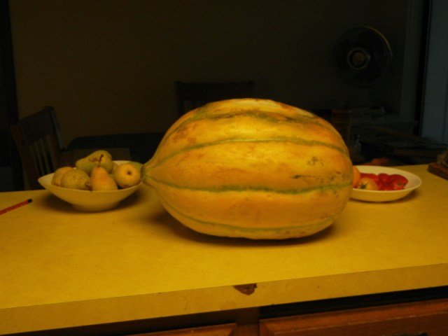 It’s a Casaba melon, and this is my best year yet growing Casabas. This one is a typical specimen. It weighs about 20 pounds. Casabas are huge football-shaped melons from Turkey, first grown in California (and maybe the United States) right here in Chico by John Bidwell. I got the seeds last year from Seed Savers Exchange, and this year planted seeds that I saved from last year.