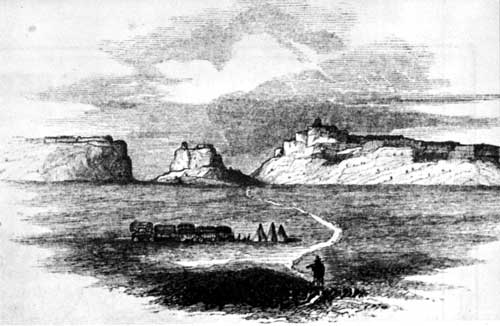 After the flat monotony of the prairies, Scotts Bluff provided a welcome change of scenery for travelers on the Oregon Trail. Many travelers remarked on the fantastic forms taken by the steep-sided hills in this area of western Nebraska. More information about the history and geology of Scotts Bluff can be found at the website for Scotts Bluff National Monument and the Oregon-California Trails Association.