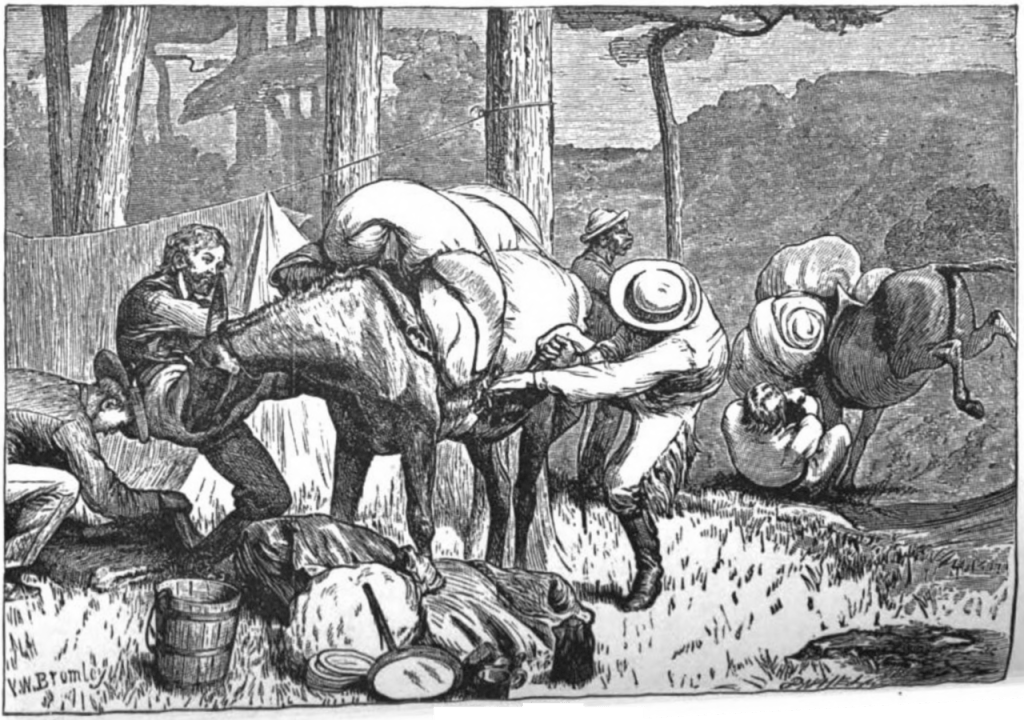 The trouble began the very first day. But we started — most of us on foot, for nearly all the animals, including several of the oxen, had to carry packs. It was but a few minutes before the packs began to turn; horses became scared, mules kicked, oxen jumped and bellowed, and articles were scattered in all directions.