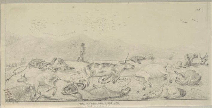 They are still by the Humboldt Sink and following the remnant of Mary’s River. By going south instead of west, they are missing out on finding the Truckee River, which later wagon trains would seek out. But that would have meant crossing the “Forty Mile Desert,” a nightmarish trek for everyone who attempted it.