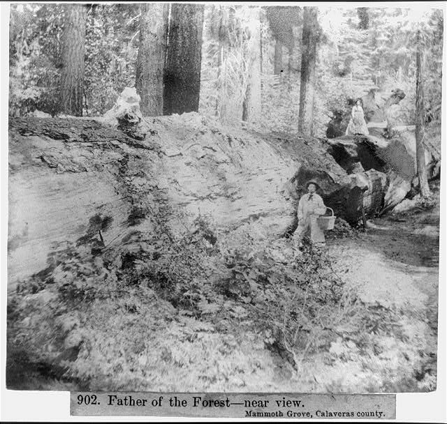 Just at dark I came to an enormous fallen tree and tried to go around the top, but the place was too brushy, so I went around the butt, which seemed to me to be about twenty or twenty-five feet above my head. This I suppose to have been one of the fallen trees in the Calaveras Grove of Sequoia gigantea or mammoth trees, as I have since been there, and to my own satisfaction identified the lay of the land and the tree. Hence I concluded that I must have been the first white man who ever saw the Sequoia gigantea, of which I told Fremont when he came to California in 1844. (Echoes of the Past)