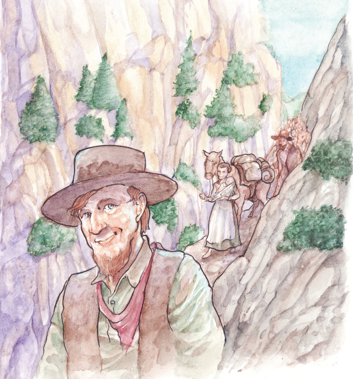 Once, I remember, when I was struggling along trying to keep Monte from going over, I looked back and saw Mrs. Kelsey a little way behind me, with her child in her arms, barefoot I think, and leading her horse — a sight I shall never forget. As we neared the stream and were passing the last projecting rock, old Monte struck the rock and would have gone over had I not braced myself and held him hard.