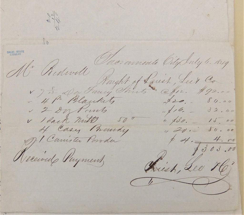 On one of my forays into the archives at the California State Library, I came across a trove of receipts saved by John Bidwell from his trips to buy supplies for his trading post at Bidwell’s Bar on the Feather River. Picture in your mind Sutter’s Fort, and then imagine John Bidwell and his partner George McKinstry going round the various businesses that had set up shop there, buying all kinds of necessary items to stock their own store. Here are a few of the receipts, with transcriptions (not all from the same trip):