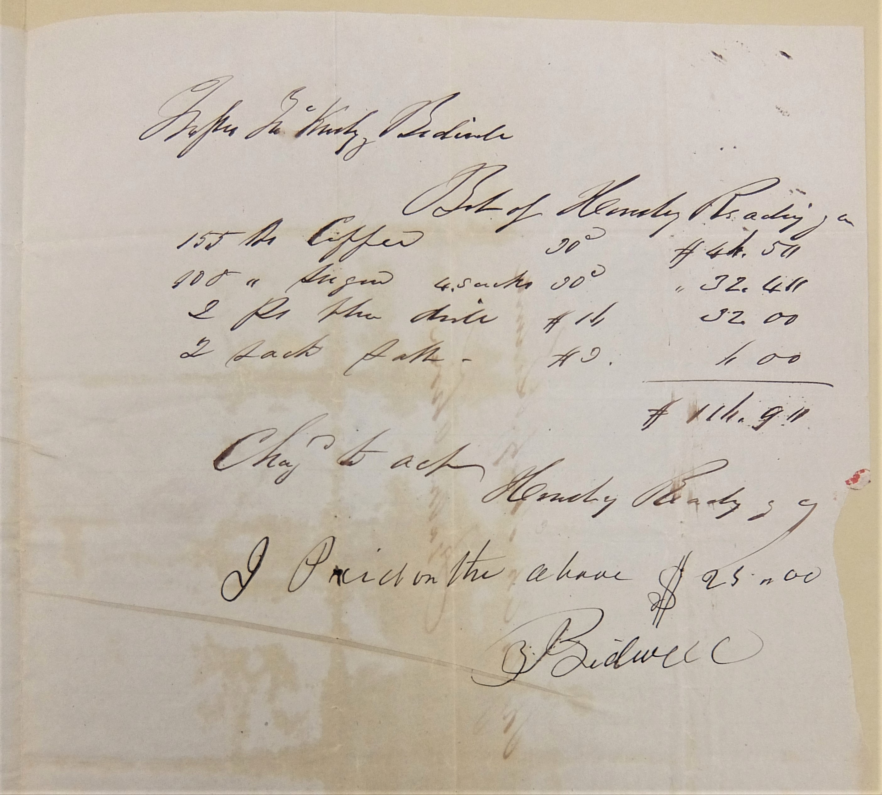 I’ll have to try doing a comparison of prices — I have photos of Bidwell’s ledger book from Bidwell’s Bar and a slew of these receipts. Might be able to match a few things.