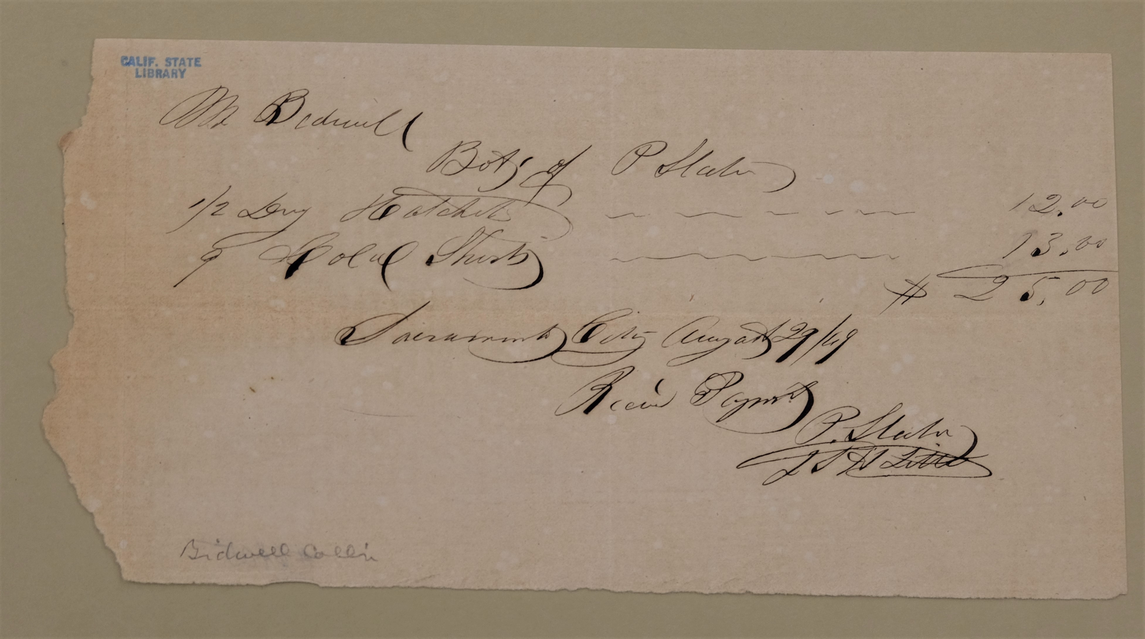 On one of my forays into the archives at the California State Library, I came across a trove of receipts saved by John Bidwell from his trips to buy supplies for his trading post at Bidwell’s Bar on the Feather River. Picture in your mind Sutter’s Fort, and then imagine John Bidwell and his partner George McKinstry going round the various businesses that had set up shop there, buying all kinds of necessary items to stock their own store. Here are a few of the receipts, with transcriptions (not all from the same trip):