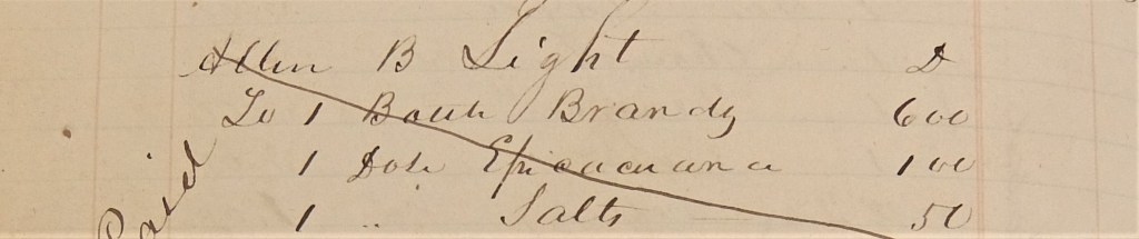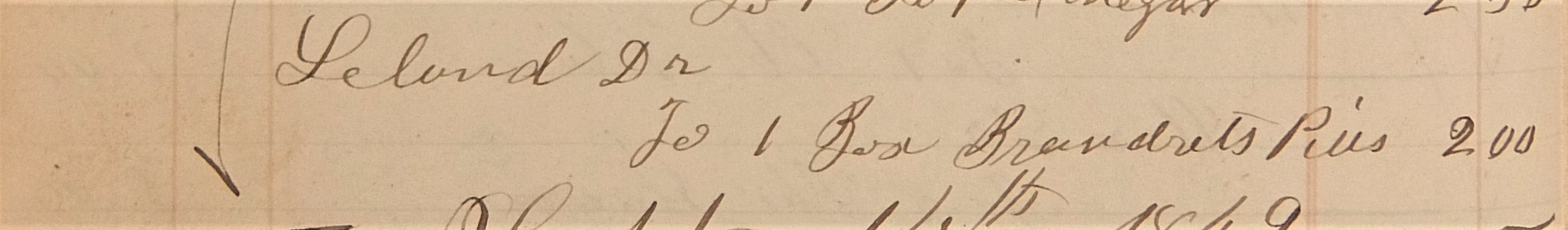 He also stocked up on Seidlitz powders, Brandreth’s pills, bicarbonate of soda, spirits nitre, castor oil, olive oil, lime juice, and a half-pound licorice ball. According to Bancroft’s Pioneer Register, Dr. Ward was a physician at Sutter’s Fort in 1847-48.