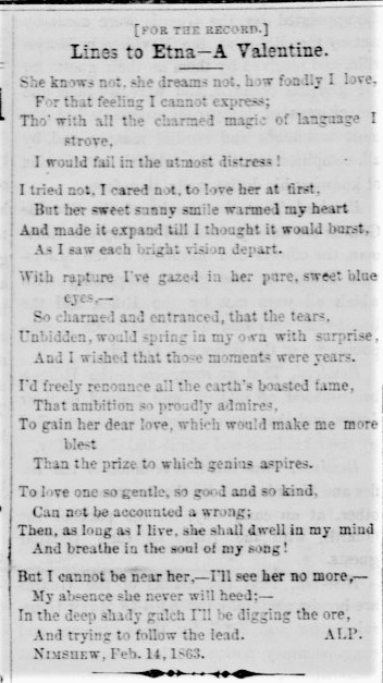 Here is a Valentine poem from our own Bard of Butte, first published in the Butte Record on February 28, 1863. He signs himself ALP, his nom de plume based on the initials of his name, Alexander Preston Longley,