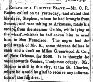 All was not lost. The night before Hill was due to leave on a steamer from Stockton for the return trip to Arkansas, Hill’s friends got Rozier drunk and Hill escaped. Rozier placed the above ad in the San Joaquin Republican, claiming that Stephen Hill was both an escaped slave and a thief. Rozier never did recapture the fugitive. Stephen Hill remained free in California, but he lost his land claim.
