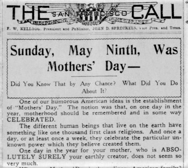 The San Francisco Call newspaper asked its readers on May 15, 1915 whether they had done anything for their mothers on May 9th (which, like this year, was a Sunday). “What did you do about it?” they asked.