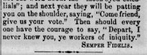 We do not desire equality with them. I hope none of us are so low and so lost to all that is noble as to wish to change places with those slave owners (all Democrats), who before the war raised men and women for the market—selling their own flesh and blood, separating husband and wife, parent and child. No, we never expect to be bad enough to be their equals. As regards color, the slave-holders did all they could to produce equality. I know many of them whose daughters in the big house were not as light as their daughters in the cabin. And when I the Democrats say, “Want your daughter to marry a nigger?” I tell them many of your daughters have married negroes, and many more would have done it, but you choose to sell them to white men to become victims of their lust. Shame! I say, l am tired of listening to their falsehoods, and thankful that the Chinese can rest. Last year it was Chinese and Negro; this year not one word about the ” moon-eyed celestials”; and next year they will be patting you on the shoulder, saying, “Come friend, give us your vote.” Then should everyone have the courage to say, “Depart, I never knew you, ye workers of iniquity.” SEMPER FIDELIS