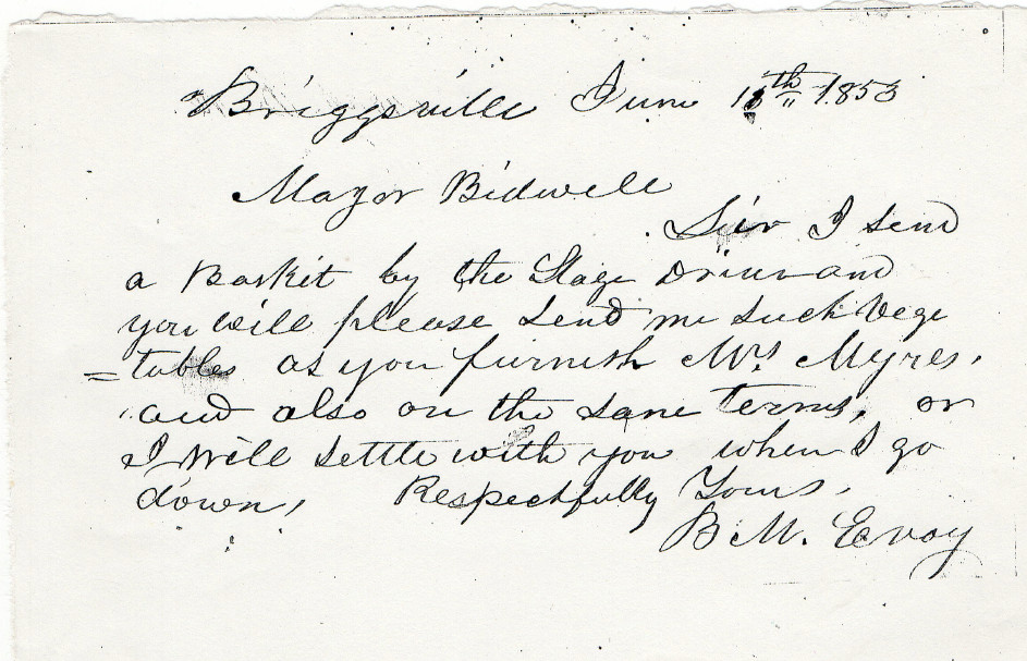 Major Bidwell– Sir I send a basket by the stage driver and you will please send me such vegetables as you furnish Mrs. Myres, and also on the same terms, or I will settle with you when I go down. Respectfully yours, B.M. Evoy