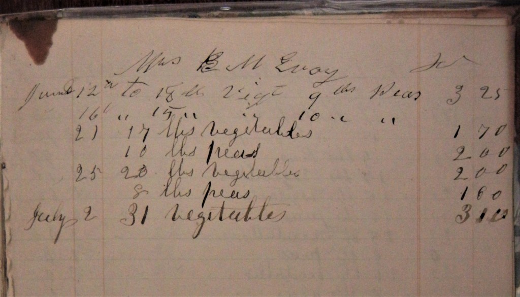 Prompt service, as you can see. She wrote her letter on the 11th and sent it with the stage driver. On the 12th, 18 pounds of assorted vegetables and 9 pounds of peas were on their way back to her. It looks like peas were 20 cents a pound, which sounds cheap enough now but was probably high for the time. All prices in California were high.