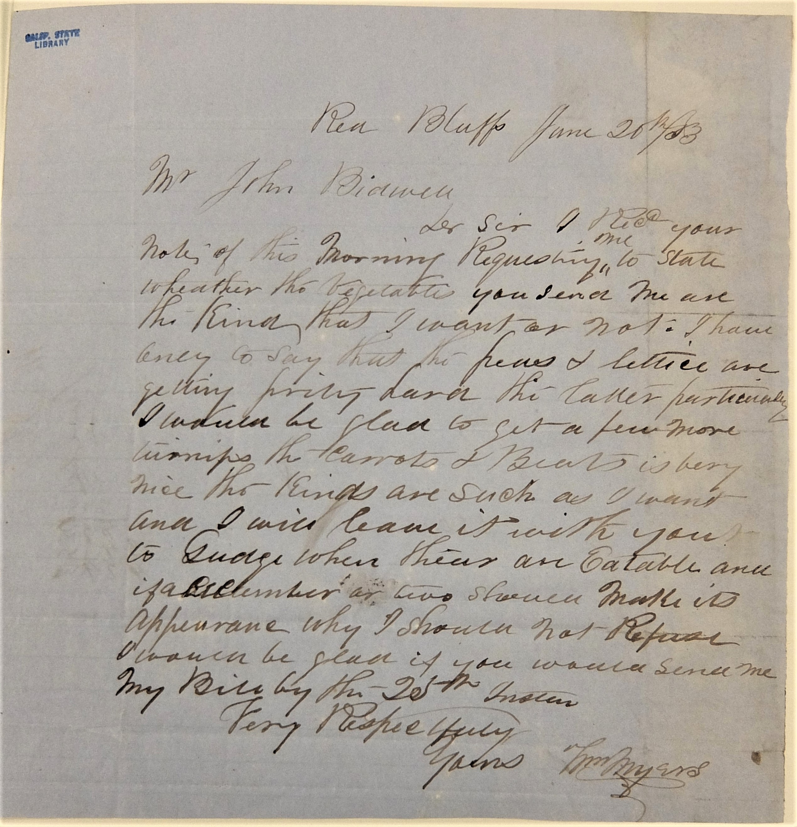 The John Bidwell Papers at the California State Library have several letters from Mr. William Myers. Bidwell was a great saver of letters, which is a boon for historians. Here is one letter requesting vegetables: