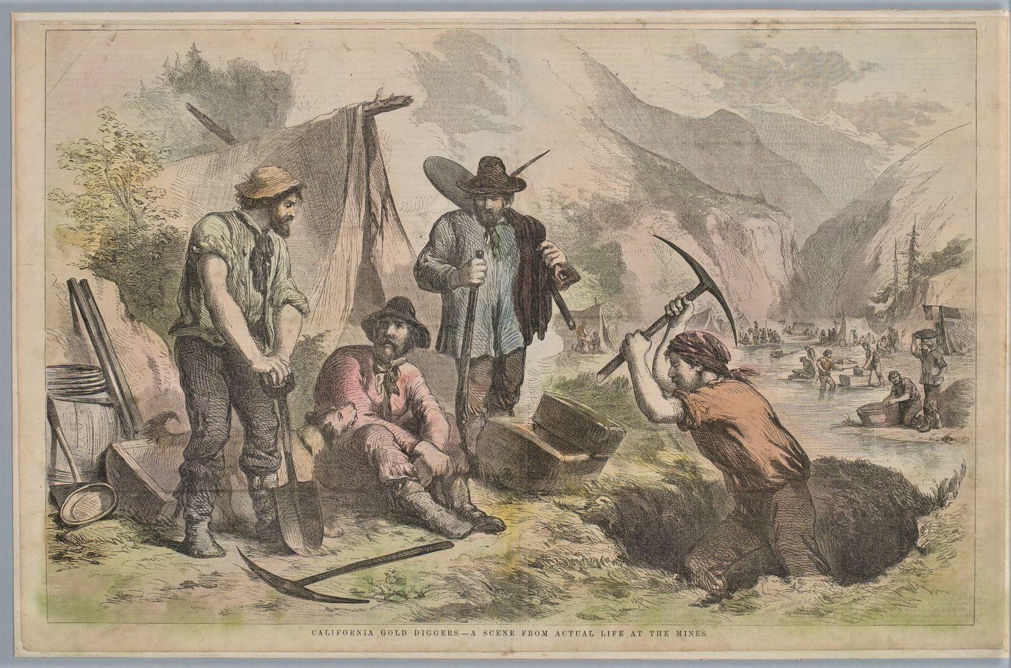 With picks, shovels, and pans, three of us accompanied him to the bottom of a deep, wild glen; not that we intended to “jump” any one’s claim, but as a possible clue to diggings above and below on this side of the river. There was no snow, and on the mossy bank of a rill could be seen the outlines where the ground had been broken; but the turf was so nicely adjusted that but few traces were visible.