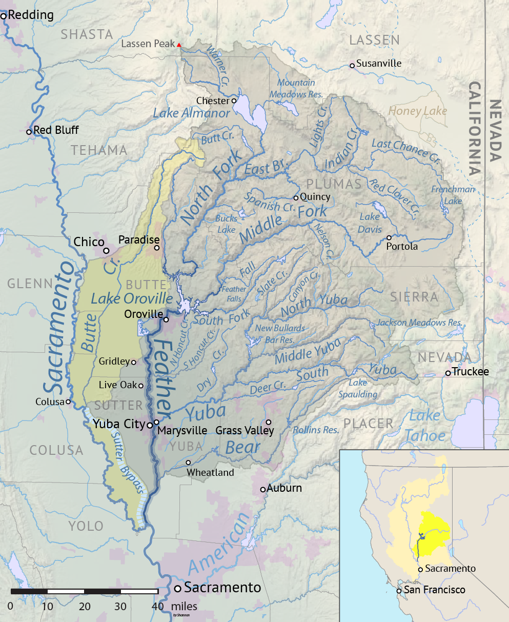 However, in several miles we were surprised and delighted to find Mountaineer Lawson’s mining camp. There were several while men and Pah Ute Indians working a placer mine on the bank of the river. Coming down the river, we saw that when we had taken for the valley of the north fork of the Feather River was only a deep gulch, and the main stream, which we had visited above the Big Meadows, lay over the mountains toward the northwest. (p. 184)