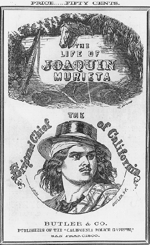 Had John Steele really met the famous bandit chief? I like to think he did. Later the legend grew up that Joaquin had survived, and more and more legends accumulated around the romantic figure of a wronged man turned outlaw. Murrieta and his gang were made famous by John Rollin Ridge (“Yellow Bird”) in his sensational book The Life and Adventures of Joaquin Murieta, published in 1854 and still available.