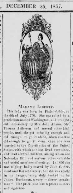 In 1856 she was mighty badly scared by John C. Fremont and Horace Greely, but she was really in no danger, being duly backed up by James Buchanan, a very “clever gentleman.” Her price (she has a price) is eternal vigilance.
