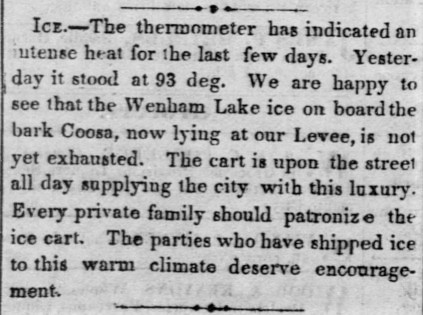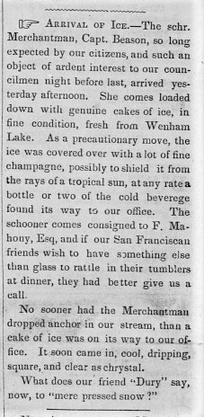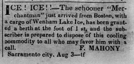 Wenham Lake ice was famous. The lake in northeast Massachusetts supplied crystal-clear ice to the eastern states, Great Britain, and all the way to California. The ad above began publication in the Sacramento Transcript at the end of July and continued through the fall.