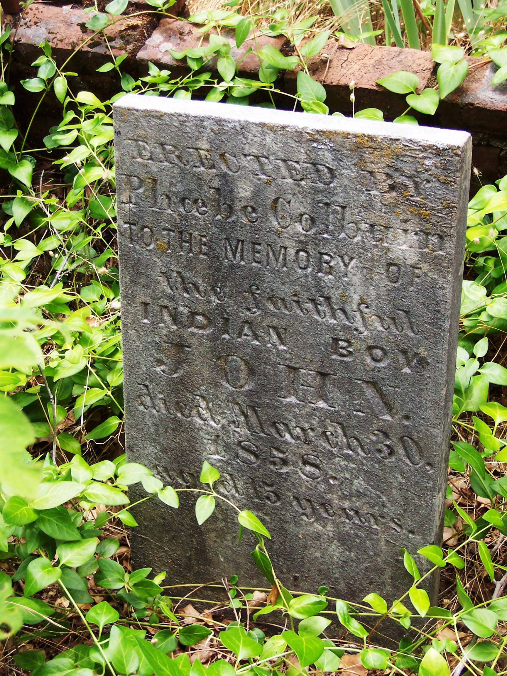 Erected by Phoebe Colburn to the memory of the faithful Indian boy JOHN died March 30, 1858 aged 15 years.