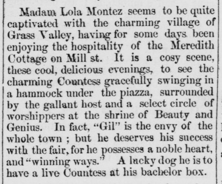 Madam Lola (as she chose to be called while a resident of this town) although eccentric in some respects, did many acts indicative of a kind and benevolent disposition. We recall her riding many miles over the hills to carry food and medicine to a poor miner. More than once she watched all night by the bedside of a child whose mother could not afford to hire a nurse. . . . Lola was one of the lions of our town; and visitors from below, clerical as well as lay, while taking a look at our quartz mills, invariably sought an introduction to her, and always returned delighted from an hour’s chat at her hospitable cottage.