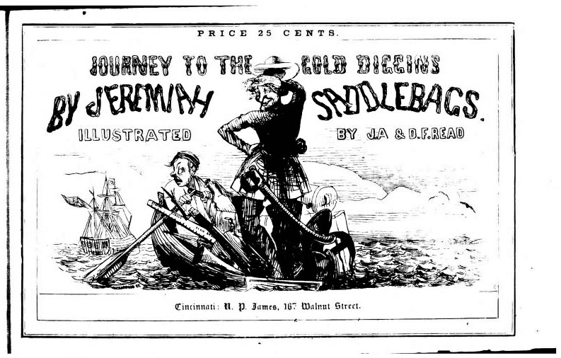 Considered the first ever American comic book, Journey to the Gold Diggins, by Jeremiah Saddlebags, is a humorous look at the California Gold Rush. It was written and illustrated by J. A. and D. F. Read (James Alexander and Donald F. Read). I don’t know anything about the originators of this work, but it showed exactly what gold-seekers could expect — mostly disaster and penury. The two author/illustrators didn’t waste any time in 1849 getting their timely picture book into print.
