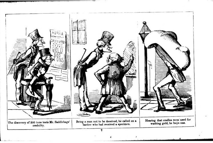 They probably didn’t have to actually make the trip to know what was in store. Jeremiah Saddlebags, a “man of fashion” is bit by the gold bug and decides to seek his fortune in California. Being totally ignorant and credulous, he buys himself a baby’s cradle to take along.