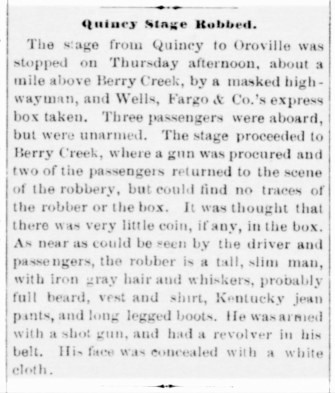 Black Bart’s first stagecoach robbery in Butte County, and his fifth overall, occurred on July 25, 1878. He held up of the Quincy-Oroville stage about a mile from Berry Creek.