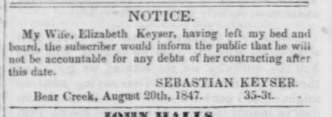 Keyser was a rough customer and the marriage seems not to have been a happy union. Six months later Elizabeth left Sebastian. He placed a notice in the San Francisco newspaper.