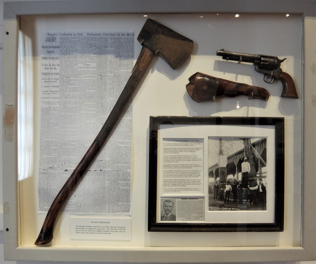 Life could be wild and woolly in old Shasta. Here is a display about the Ruggles brothers, who held up a stagecoach. They used the pistol in the holdup and used the ax to bust open the strongbox. You can see that they didn’t get away with it and justice was swift.