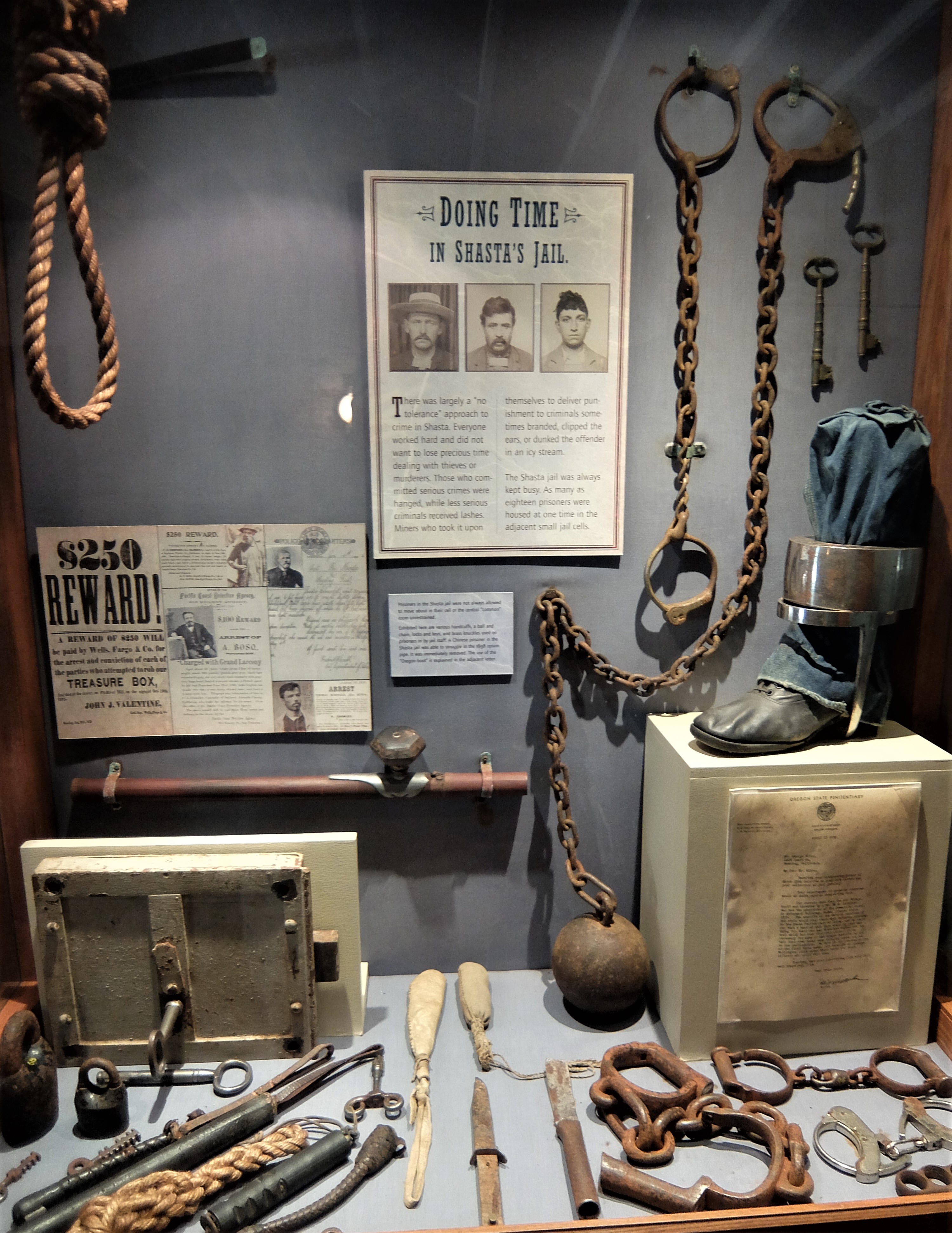 Downstairs you can see the jail, with an appropriate collection of leg irons, handcuffs, nooses, truncheons, and a horrible hobble called an “Oregon boot.” The gallows is just outside.
