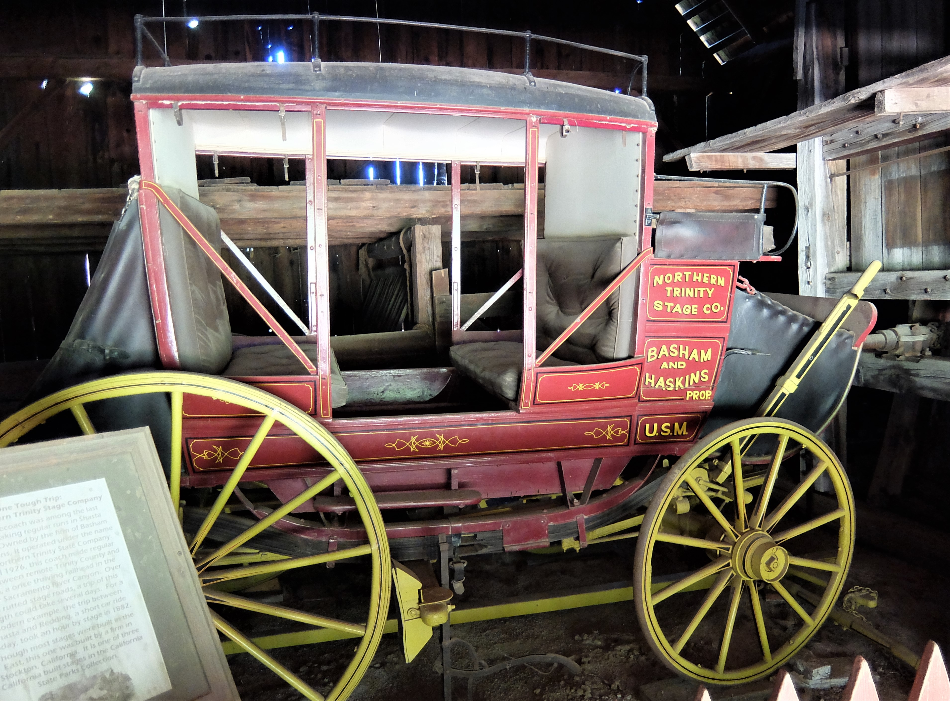 It’s not all display cases at Shasta State Historic Park. We ate our picnic lunch in the wide shade of a leafy oak tree, then went inside the barn to admire a handsome stagecoach that once plied the route from Trinity County to the Sacramento River.