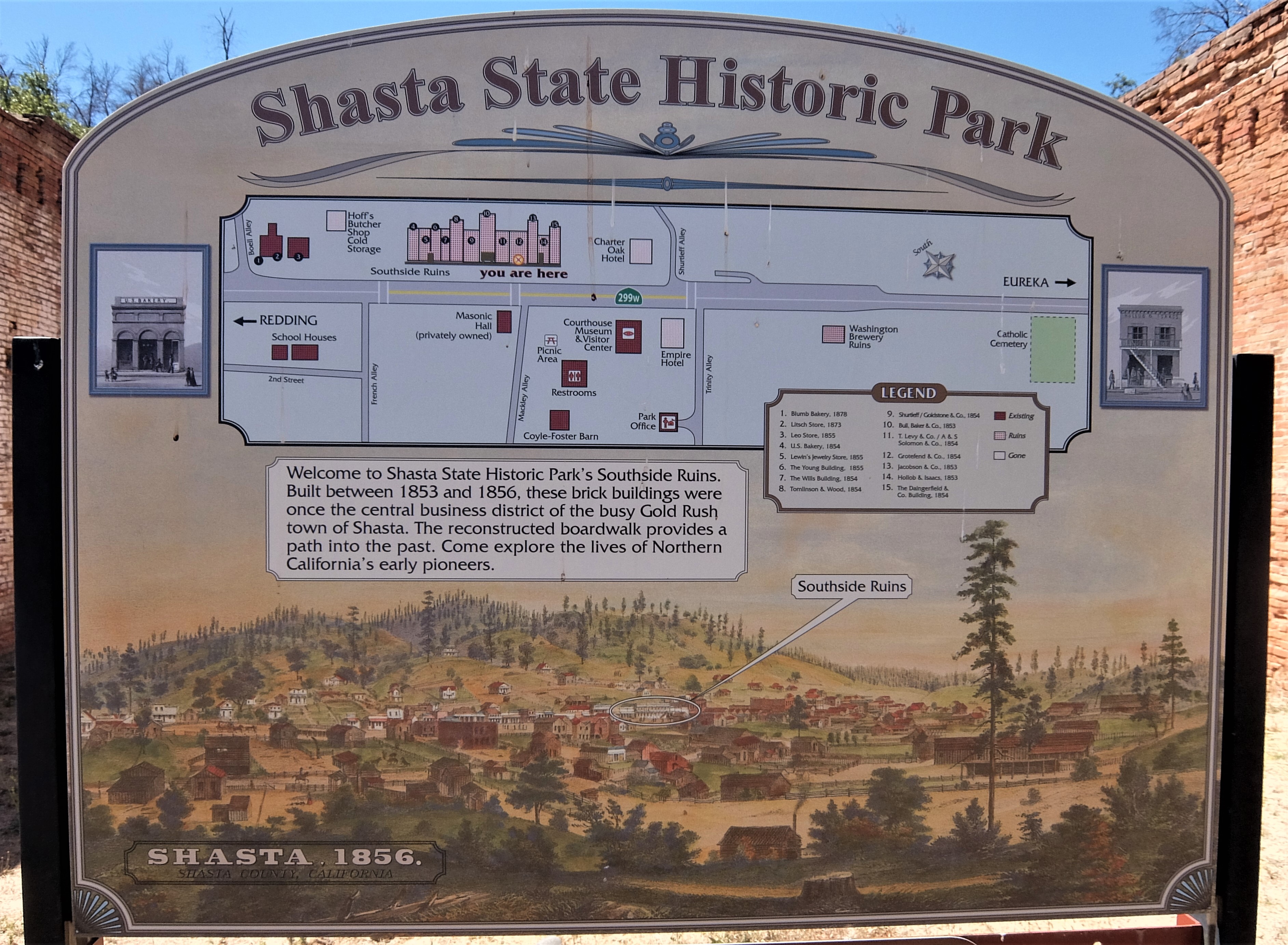 After that we ran across the road to see the “Southside Ruins,” the remains of the brick fire-proof buildings that once were a central feature of Shasta, the “Queen City of the Northern Mines.” It’s all well worth a visit. You can even get lunch or an ice cream at Shorty’s Eatery, open under new management.