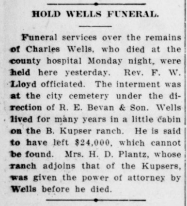 Here is the obituary for Charles Wells, from the Marysville Appeal, 18 November 1914.