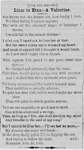 Lines to Etna -- A Valentine She knows not, she dreams not, how fondly I love, For that feeling I cannot express; Tho' with all the charmed magic of language I strove, I would fail in the utmost distress! I tried not, I cared not, to love her at first, But her sweet sunny smile warmed my heart And made it expand till I thought it would burst, As I saw each bright vision depart. With rapture I've gazed in her pure, sweet blue eyes,-- So charmed and entranced, that the tears, Unbidden, would spring in my own with surprise, And I wished that those moments were years. I'd freely renounce all the earth's boasted fame, That ambition so proudly admires, To gain her dear love, which would make me more blest Than the prize to which genius aspires. To love one so gentle, so good and so kind, Can not be accounted a wrong; Then, as long as I live, she shall dwell in my mind And breathe in the soul of my song! But I cannot be near her,-- I'll see her no more,-- My absence she never will heed:-- In the deep shady gulch I'll be digging the ore, And trying to follow the lead. ALP Nimshew, Feb. 14, 1863