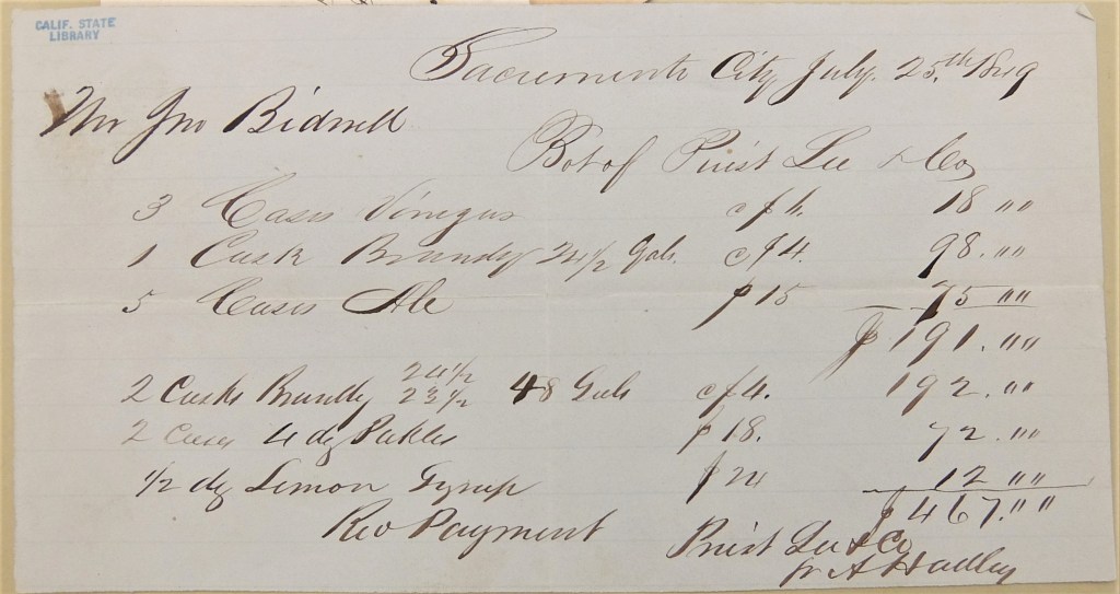 To give you an idea of prices in Sacramento, here is a receipt for purchases John Bidwell made in July 1849: