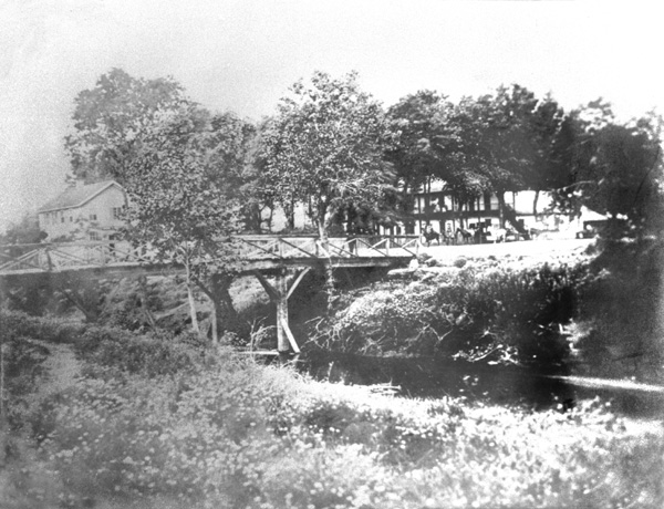 In this image you can see Bidwell’s store on the left, the bridge over Chico Creek, and the old adobe building on the right, surrounded by cottonwood trees and a few horses and people.