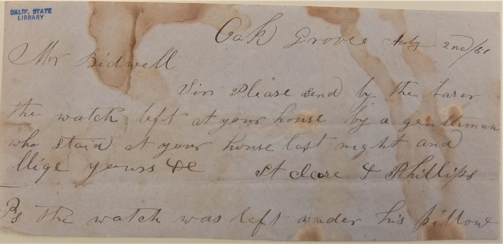 At any rate, everybody knew that they could get a meal and a bed (with a pillow — such luxury!) at Bidwell’s Ranch. I hope the gentleman got his watch and the lady got her blue coat back.