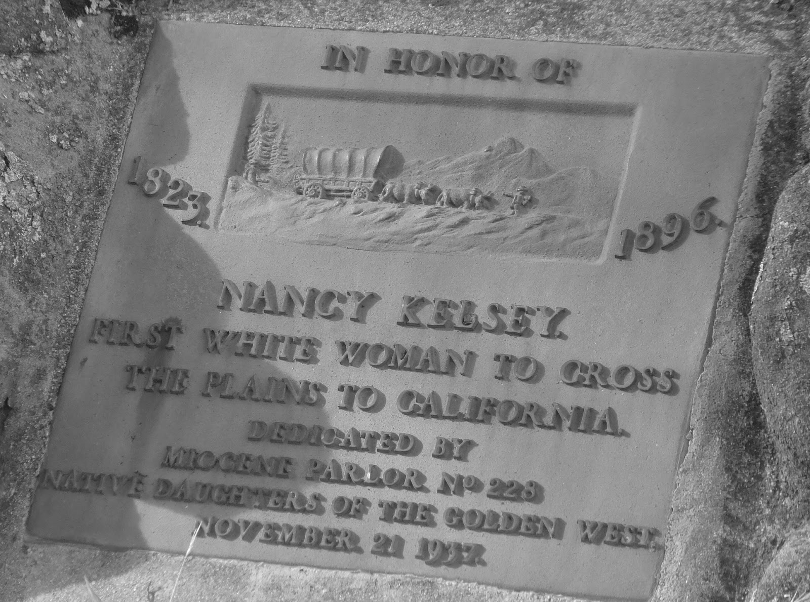 In 1937 members of the Miocene Parlor of the Native Daughters of the Golden West erected a handsome marker honoring Nancy Kelsey over her grave.