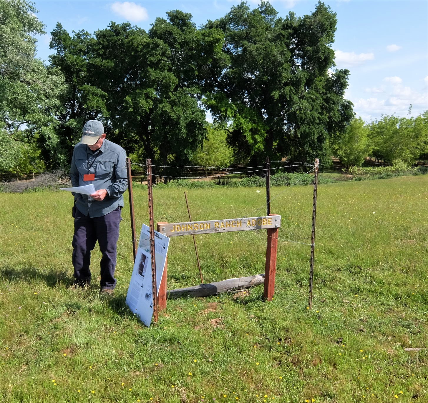 That’s our guide, Bill Holmes, standing next to the marker for the Johnson’s Ranch Adobe House. The posts and barb wire around the marker are necessary to keep the cattle from pushing down and tearing up the marker.