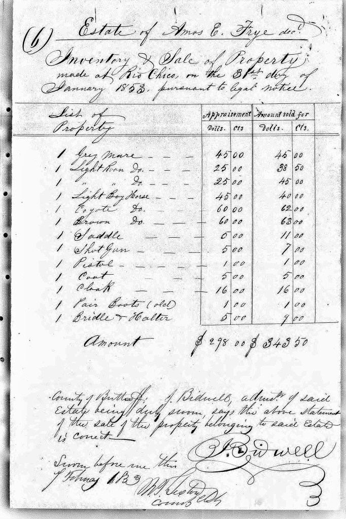 Here is the inventory of Frye’s property sold at Rancho Chico. My thanks to “Rooty” who posted this on findagrave.com.