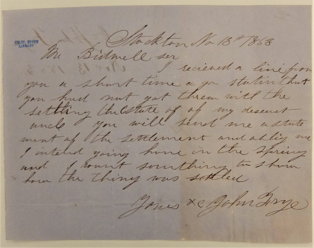 Who inherited? Amos Frye had a nephew living near Stockton, who wrote to Bidwell in November 1853 that he was contemplating returning to the States in the spring and would like to have the estate settled by then.