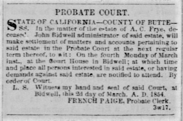 Bidwell, as Frye’s employer, became the executor of his estate. Frye’s few possession were sold at auction in January 1853. An entire year went by until probate was settled in court.