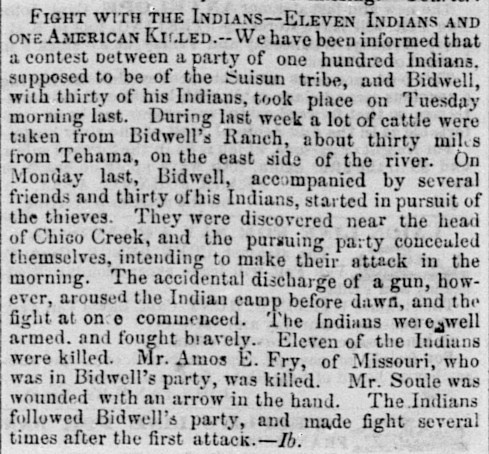Amos Frye’s death made him famous in a way that his life never would have. The story appeared in the Shasta Courier, the Sacramento Daily Union, the San Jose Republican, the Daily Alta California (San Francisco), and others around the state. It even showed up as far away as New England (last paragraph in the second clipping).