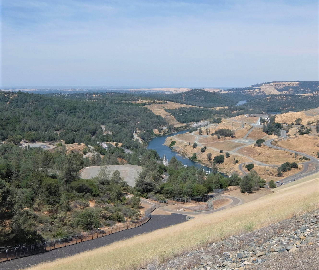 At 770 feet, Oroville Dam is the tallest dam in the United States. (Hoover Dam is 726 feet high.) Standing by the road that crosses the top of the dam and looking west, you get a beautiful view of the Feather River with the city of Oroville and the Sutter Buttes in the distance. Looking to the east, it’s all blue water and green trees. (The orange barrier in the last photo prevents boats from getting close to the spillway intake.)