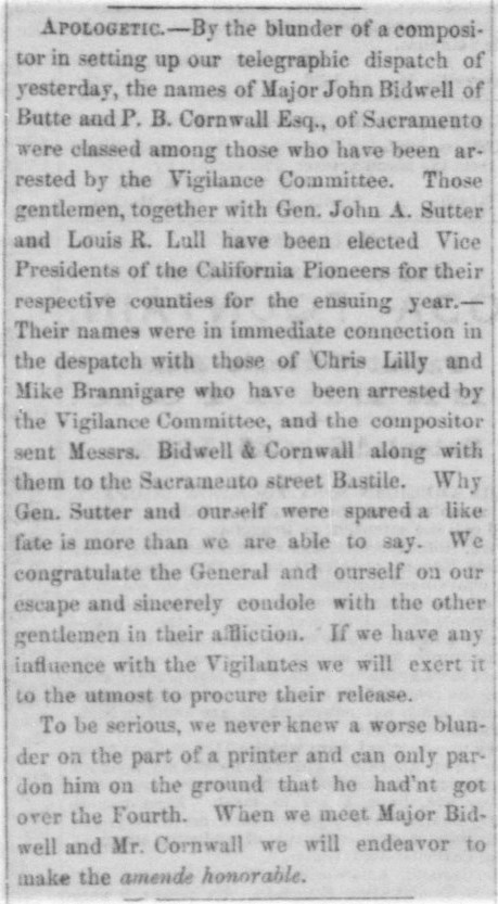 Why were they honored with such a hefty and delicious gift? It seems to have been a case of “no hard feelings.” When the Herald published the news from San Francisco, the compositor had mixed up two stories and put the names of John Bidwell and P.B. Cornwall down as men arrested by the Vigilance Committee, when instead they had been elected to the governing board of the Society of California Pioneers.