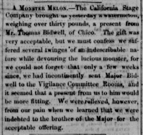 On August 1st, 1856, The Marysville Daily Herald published their thanks for the gift of a 30-pound watermelon, sent by Thomas Bidwell, younger brother of Major John Bidwell.