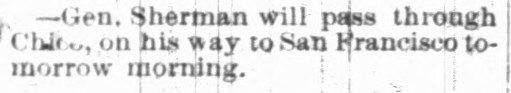 In 1877 Sherman made a trip to the West Coast to inspect Army posts. Everyone hoped to see him and speak to the hero. But he could be elusive. On his journey by stagecoach and train from Oregon to San Francisco he passed through Chico. An item in the Chico Enterprise announced his imminent arrival.