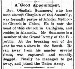 Widely popular and admired, Obadiah Summers was appointed the first black chaplain to the California State Assembly in 1895. The Chico Weekly Enterprise remembered and congratulated him.
